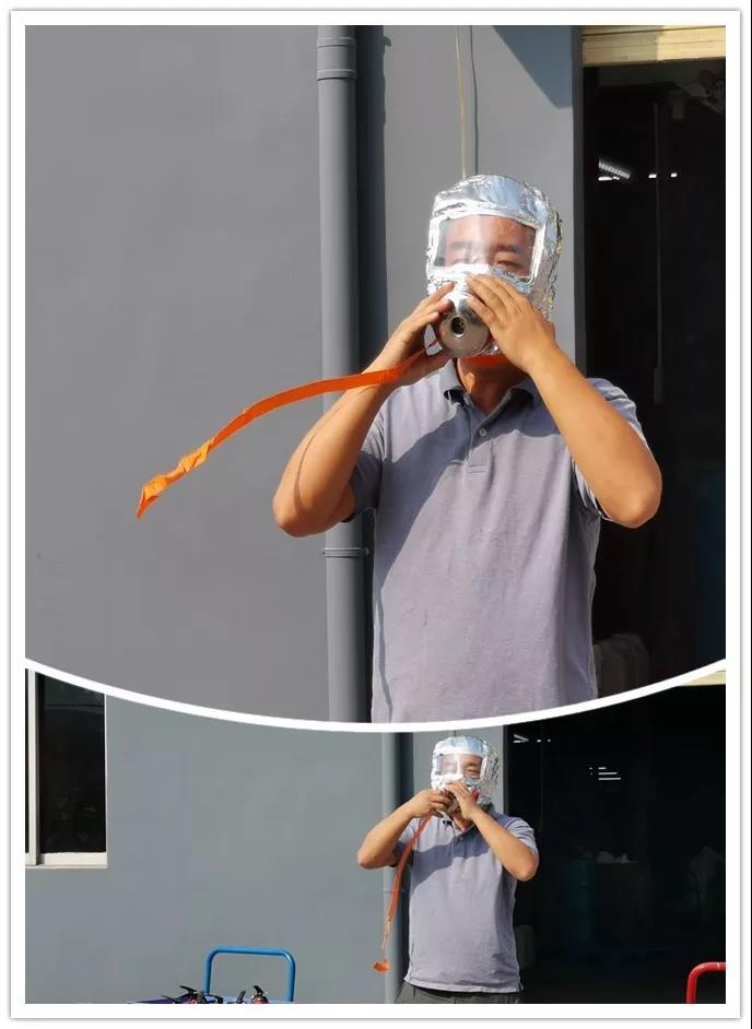 搶答完成後,負責公司消防器材維護的大劉,教大家如何正確使用滅火器、防火麵罩及消防栓。