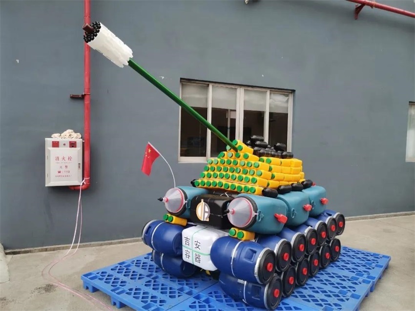 用鐵箍桶組成的坦克,搭配方瓶蓋作為點綴,1L方瓶作為主體,大炮用指甲油瓶拚接而成,方罐、漏鬥、圓瓶等采用多係列產品進行混搭,居然視覺上毫無違和感,整體效果棒棒噠!
