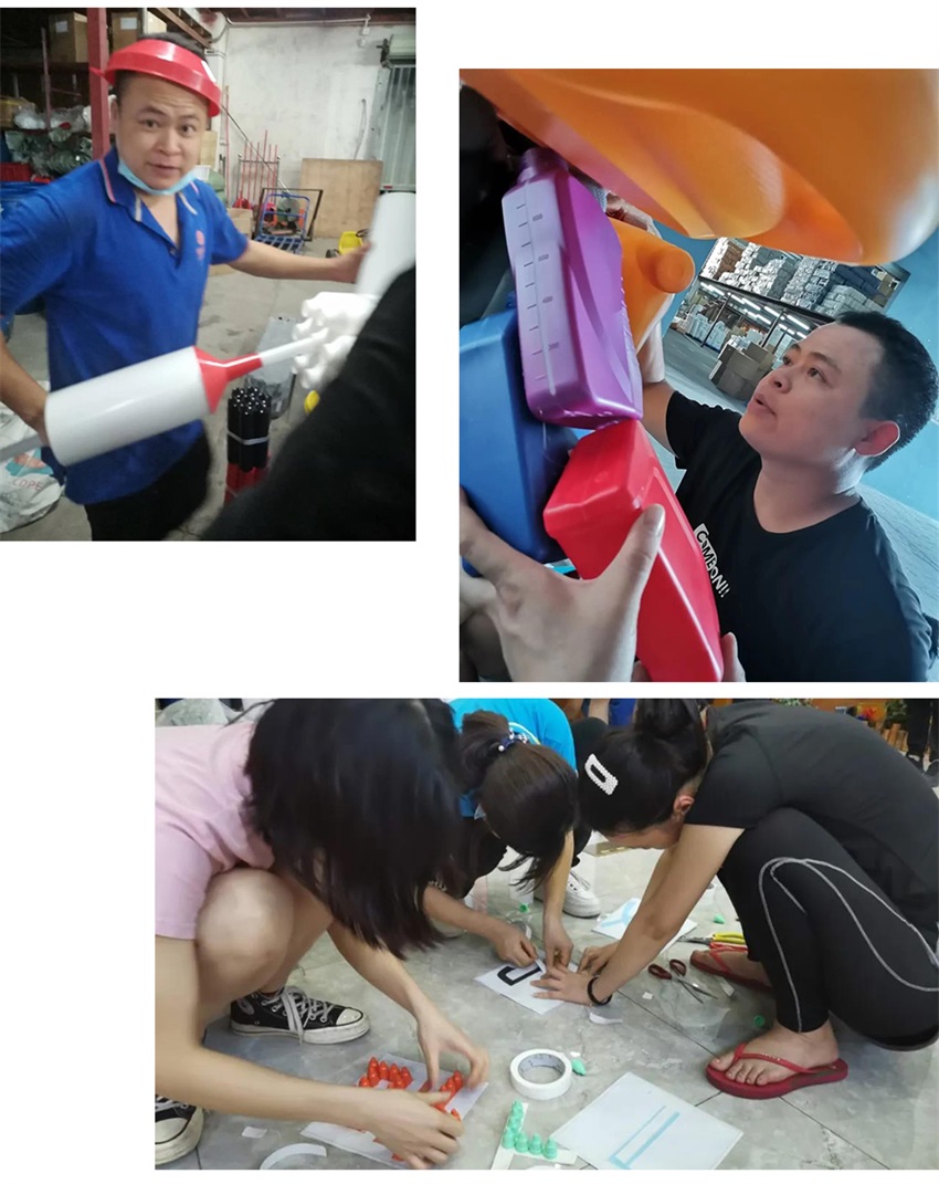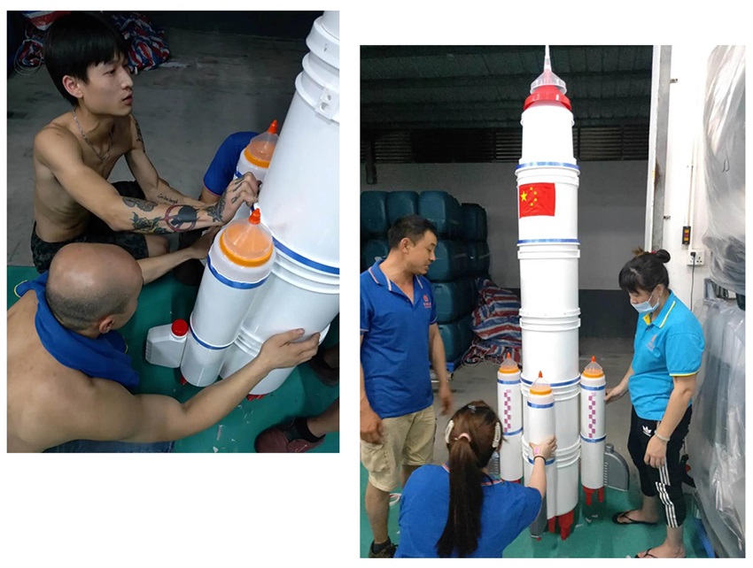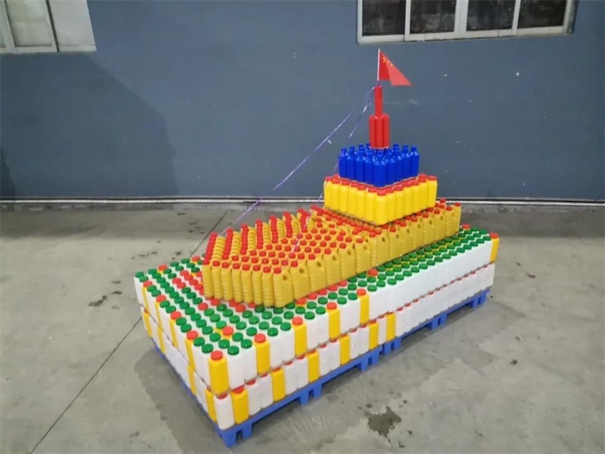 該隊模型作品”一波三折”,前期討論了多種方案,最終借鑒超市堆碼花式陳列的方式,確定做輪船,用方瓶,圓瓶、機油瓶係列進行輪船的設計,該作品象征manbetxAPP安卓未來將繼續乘風破浪,披荊斬棘,勇往直前,揚帆遠航。