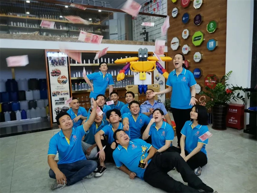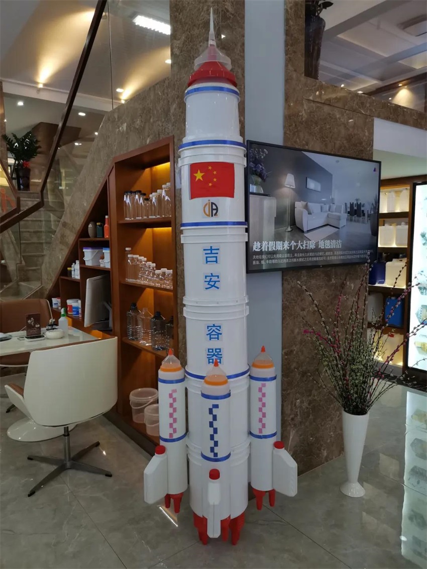 在試用了鐵罐、灰色機油瓶、膠水瓶等產品均不理想之後,最終敲定采用純色風格產品元素搭配藍色邊框設計,發射中的火箭寓意我們團隊業績一飛衝天,直衝雲霄!