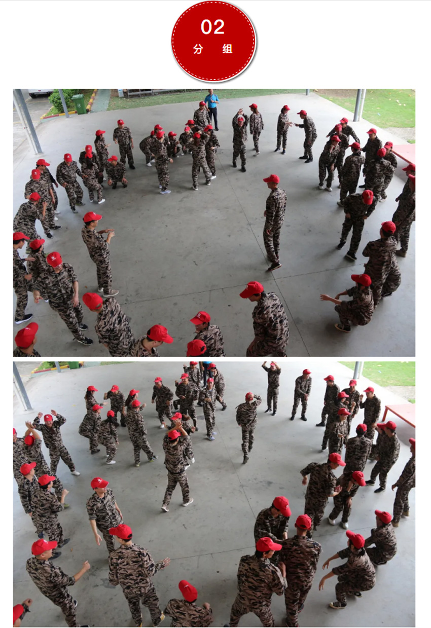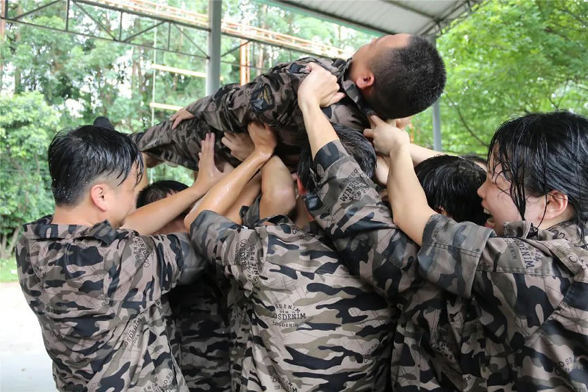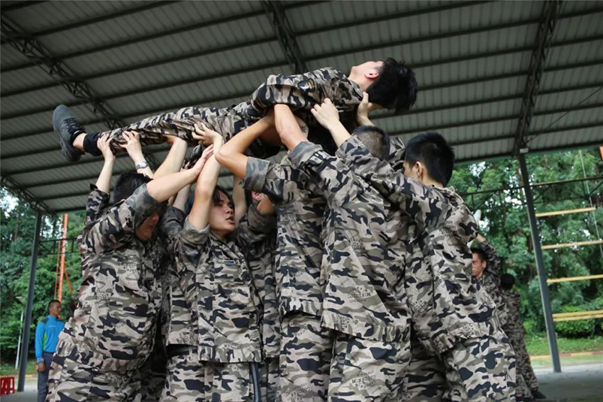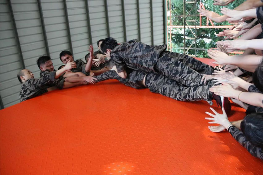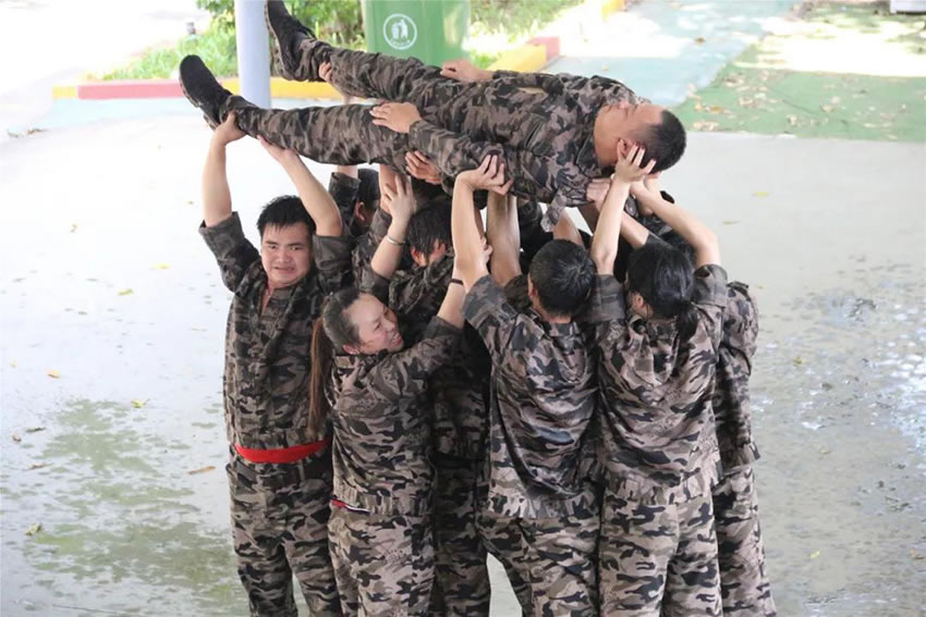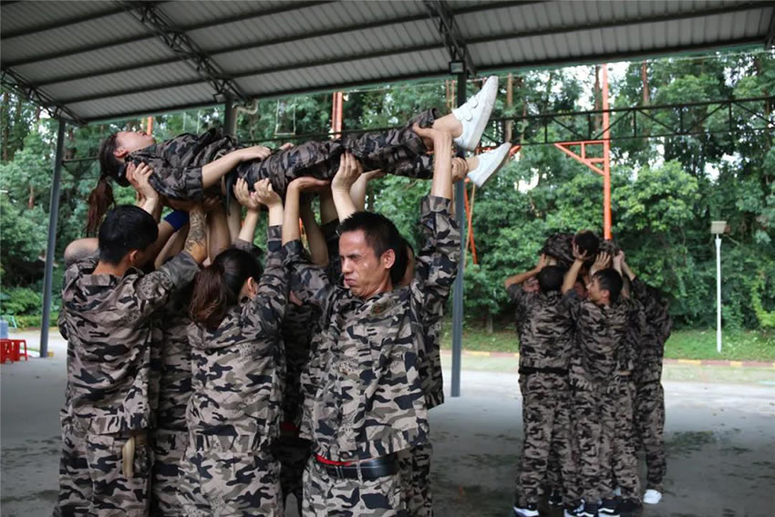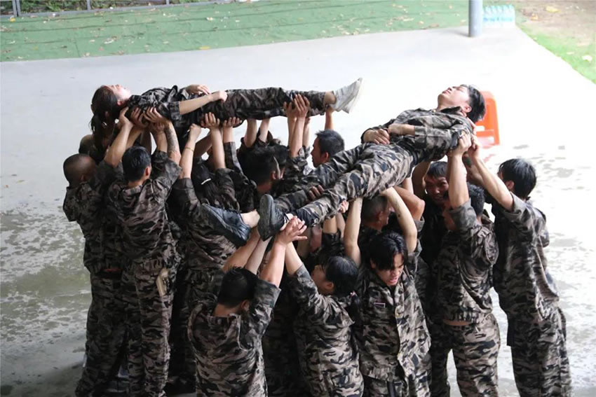 2 、被托舉的學員必須全身放鬆,整個過程中堅持托舉30分鍾;在這期間組員不能鬆懈,手臂必須保持伸直的狀態,過程中如有學員違反任何規則,將增加全體托舉時間或者減少托舉人數。