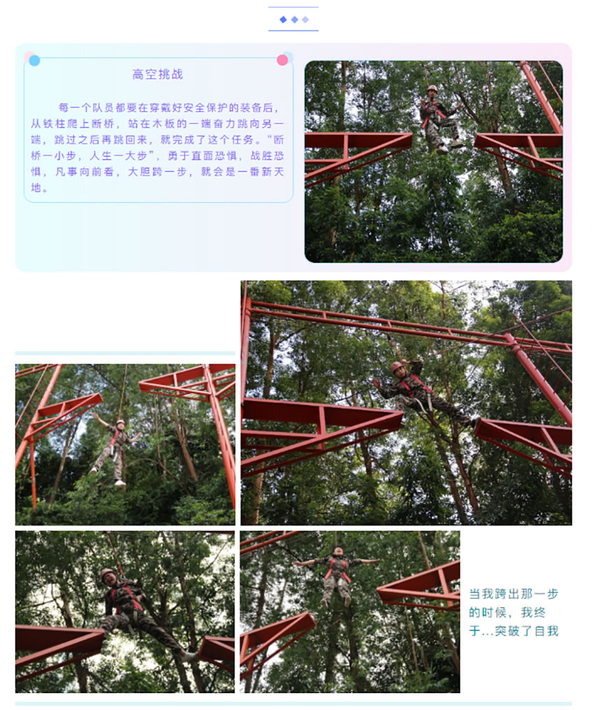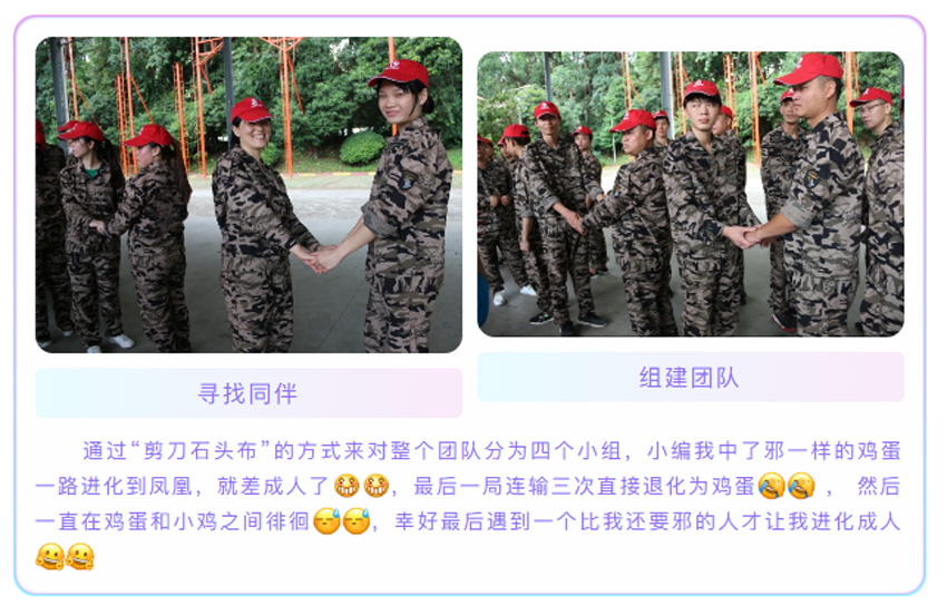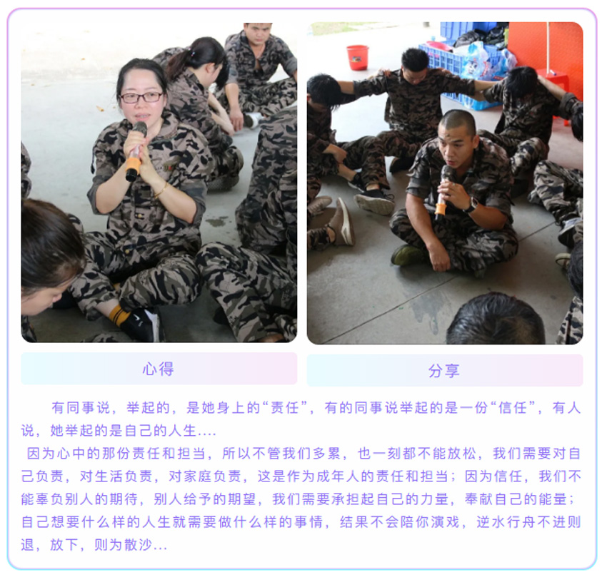 通過重複站軍姿、喊口令的方式,訓練我們的自律能力,在教官嚴格的命令下,我們必須像軍人一樣的站直,紋絲不動,我們要根據教官的要求完成任務,並不是要求我們的動作要和軍人一樣標準,最重要的一點是要學會軍人的態度,態度及心態決定一切,你是以什麼樣的心態來對待一件事情,就會帶來什麼樣的結果。在最後的執行教官在30秒鍾之內找到6個人擁抱大聲說出“你是我最棒的朋友”這一環節中,對我觸動頗深,當我聽到命令後馬上展開了行動並且迅速提前完成了任務,感到沾沾自喜。可環節結束後教官問我們,你能做得更好嗎?你的時間和能力就隻能完成6個了嗎?我想,是啊,我明明可以做得更好,我還有時間,為什麼我會在完成指標後停住?是自己理解錯了教官的意思還是我隻想完成相對應的任務,僅此而已呢?我想,兩者都有,我在工作中是否能夠“創造更高價值?奉獻更大力量?”我是否可以發揮更大空間?我是否做到公司文化中的其中多一點:做任何工作,盡可能比公司和上司要求的多一些,超越他們的期望。。。在這個環節,我們首先學會的是,做人的心態;對待工作的態度。