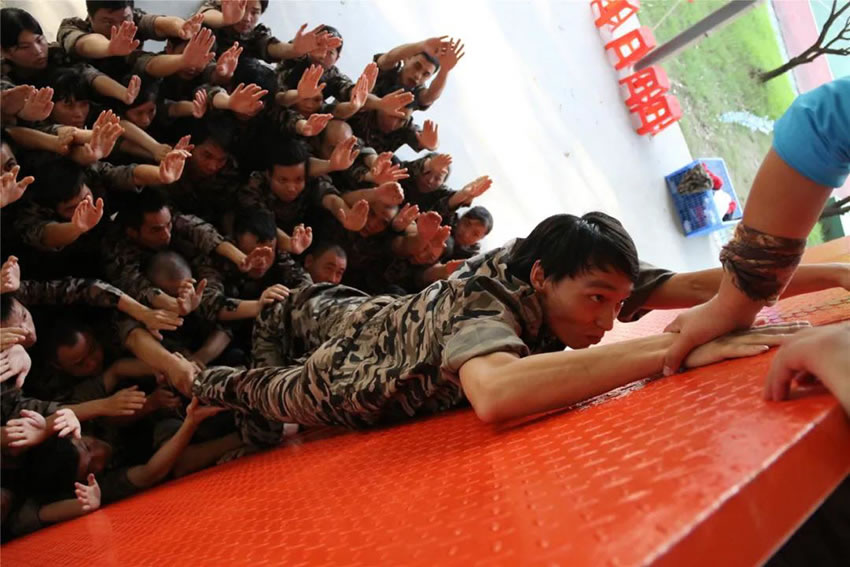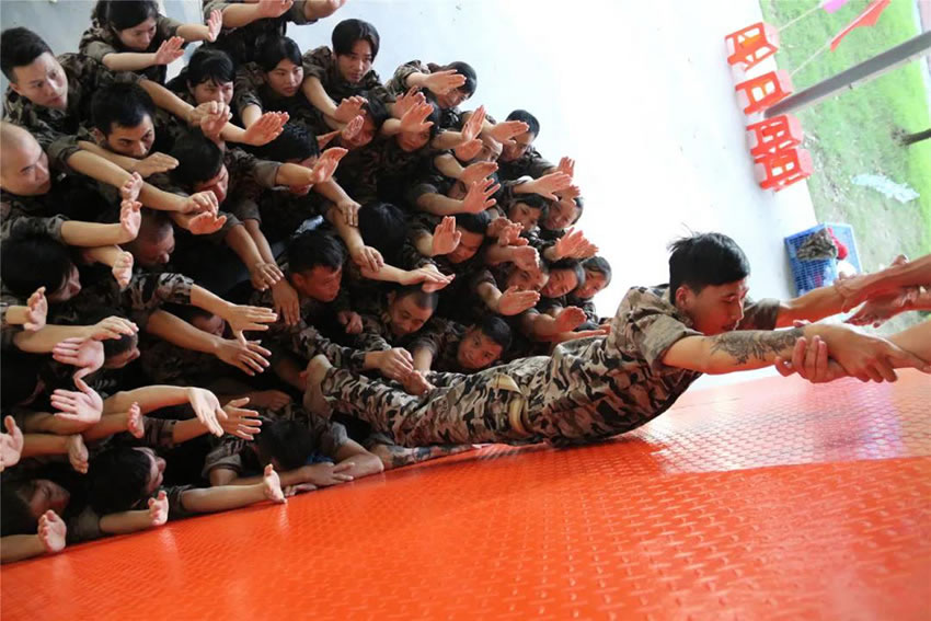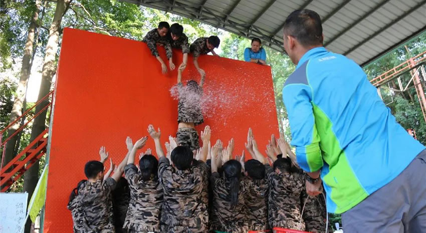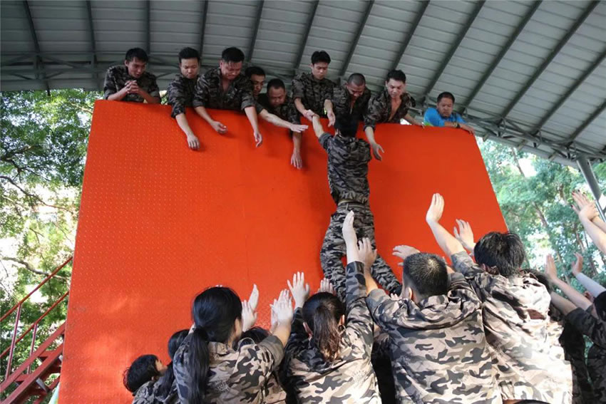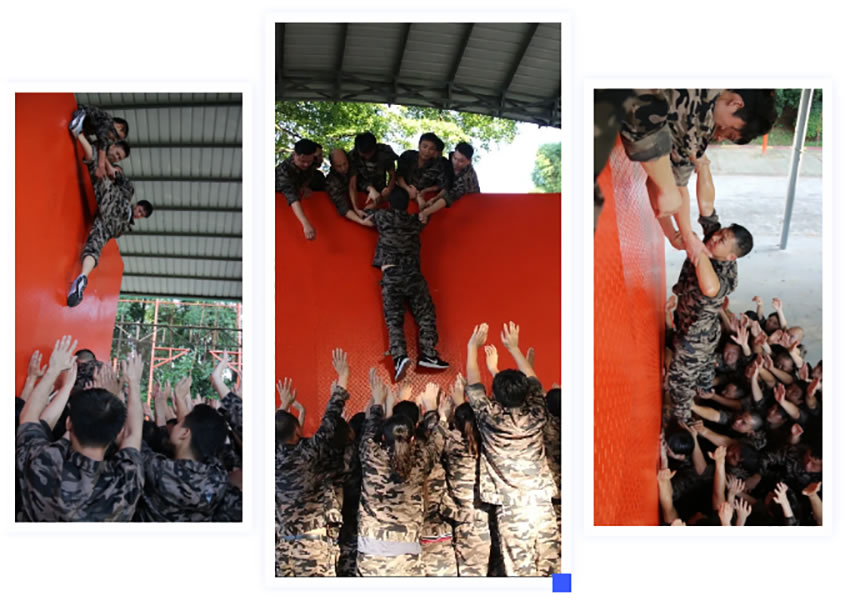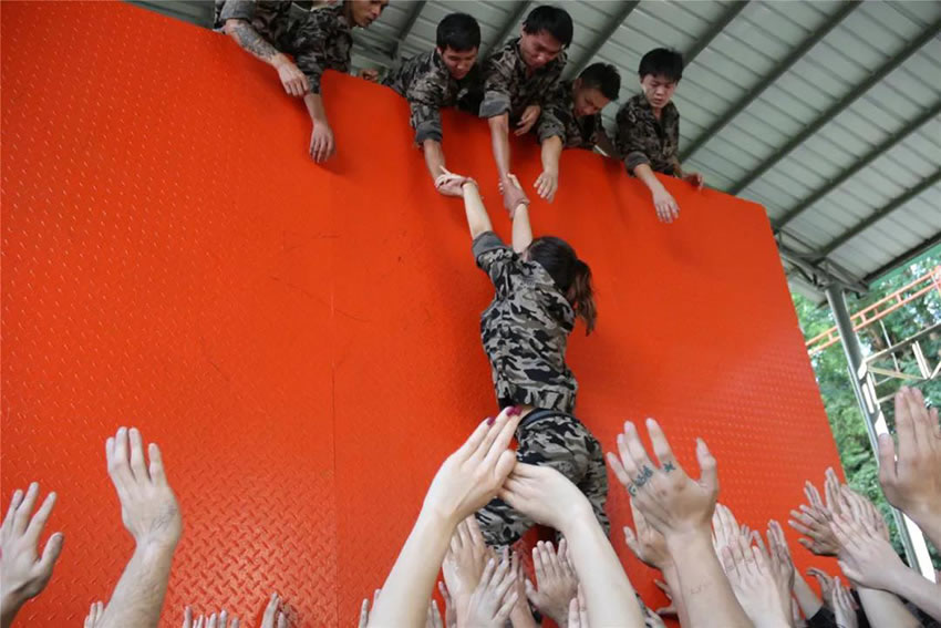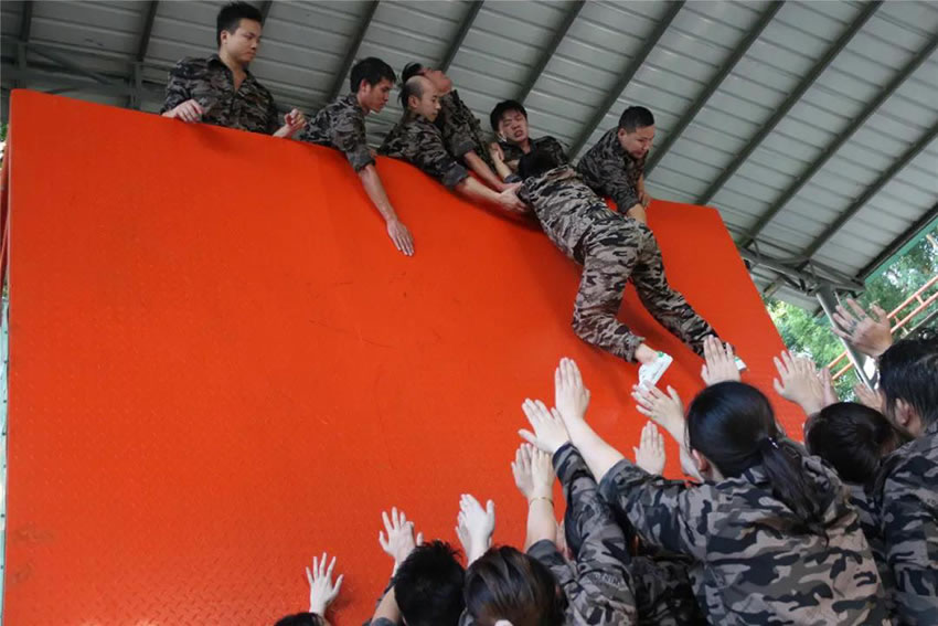 所有參與者在不借助任何工具和外力的情況下,相互協作,堆成人牆,每人徒手翻越過一堵 4.2 米高的牆。所有過程都隻需要通過人力,不能自主蹬牆爬牆,不管環節中哪一個人犯規哪怕是最後一位,也需要整個團隊重新再來。