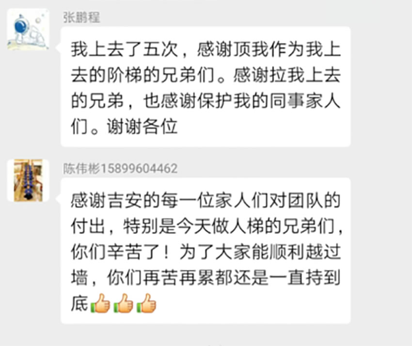 大家用肩膀、大腿、手臂,血肉之軀,組成了一麵梯子,一個個踩著他們,翻過那麵牆, 我們用無聲的語言,一個個把同事送上牆的另一麵,當第一次腳踩在人身上的時候,原來,痛的不僅僅是被踩的那個人,當腳踩在別人身上不敢用力,而不用力根本上不去的時候,心中有一塊地方,隱隱作痛,當上麵的人用堅定的眼神向你伸出了雙手,用他最大的力量把你拉上來時,在沒有任何保護隻有人牆的情況下,內心想的不是恐懼,而是放心,我放心我的夥伴不會 讓我掉下來,我放心我上麵的夥伴會把我拉上來,我感謝那些拉我、推我、扶我鼓勵我的每個人。我看到了那個從頭到尾踩了不下上百次的人牆,他從頭到尾沒有叫過一聲的累,哪怕是教練說,累了,可以換人,可是,他們,從開始到結束,默默的承受這一切,你退下了,總有人要頂上,痛苦不會因為放棄而結束,而總會有人,負重前行。