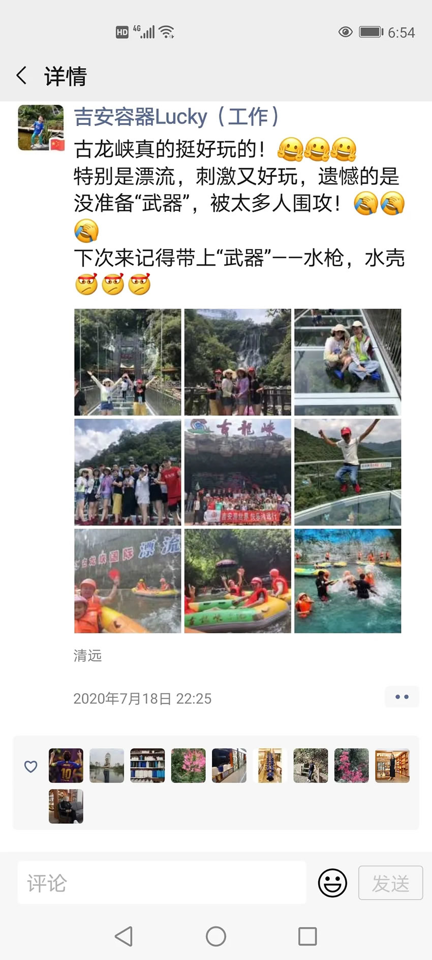 清遠之行結束了,這次旅行我們收獲了很多。除了旅行遊玩的快樂,我們的團隊更加具有凝聚力。活動中很多人為集體默默奉獻,有些項目不可以帶手機和首飾,就能看到一個人拿著二十幾部手機為挑戰極限的同事加油打氣的場麵......