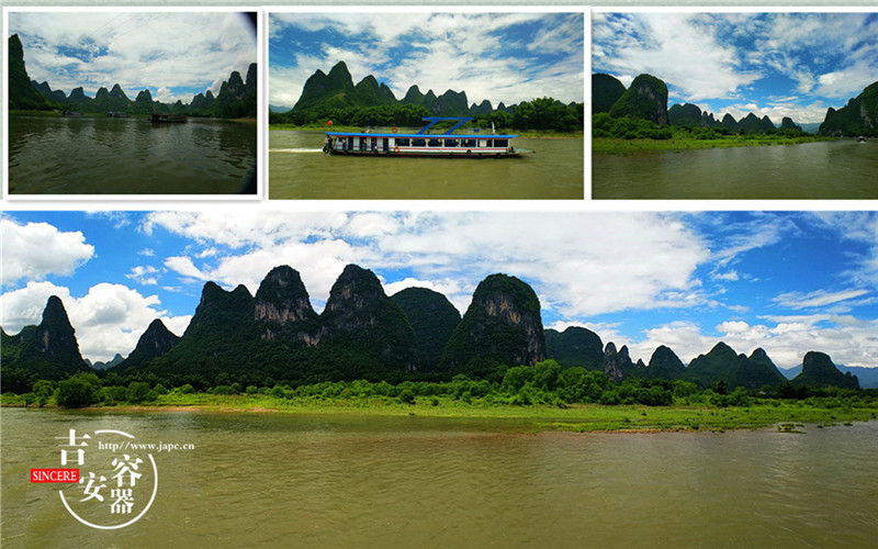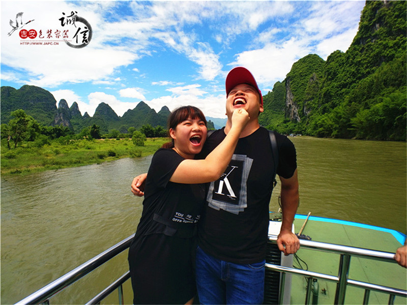用餐後前往位於陽朔擁有1400多年曆史的【興坪古鎮】,搭乘遊船欣賞【興坪漓江】。興坪漓江段是漓江最精華,風光最美的一段:兩岸群峰競秀、碧水球流,沿岸有溜圓扭卷的螺螄山、挺肚憨笑的羅漢山、一僧一尼正麵對麵鬥嘴的僧尼山、20元人民幣背景——黃布倒影等景點;首批出遊的同事看到的是陽光明媚的桂林,第二批觀賞到的則是“煙雨桂林”,蒙蒙中透著一股朦朧的美。
