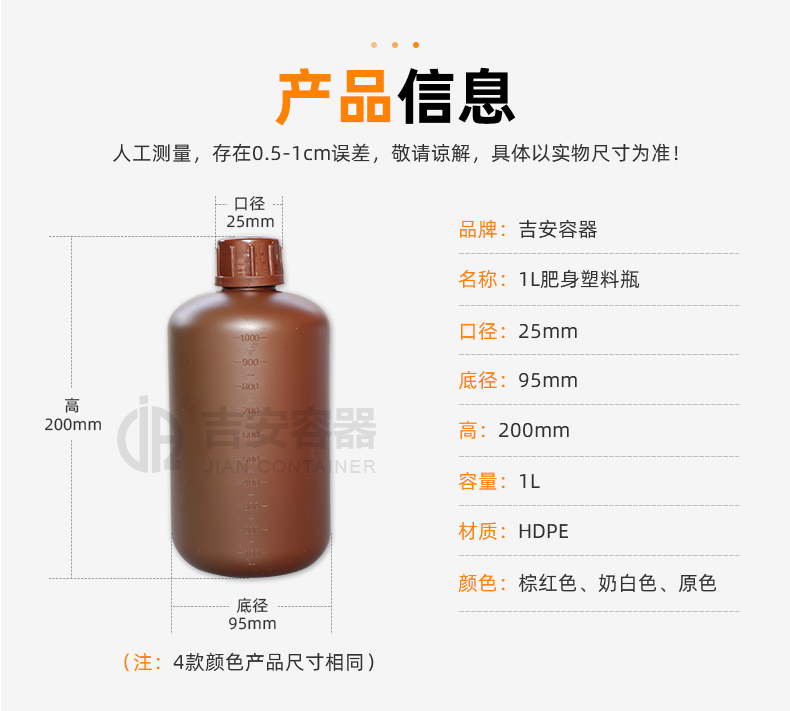 小口塑料瓶采用全新HDPE塑膠原料吹塑而成,具備韌性好、耐酸堿、耐腐蝕、不變形,密封性能佳等特點,可根據客戶需求定製、改色、產品適用於化工、清洗劑、醫藥、液體、食品、農業等各行業包裝。