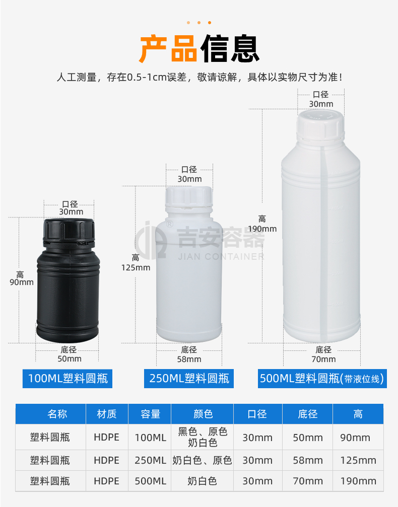 小口塑料瓶采用全新HDPE塑膠原料吹塑而成,具備韌性好、耐酸堿、耐腐蝕、不變形,密封性能佳等特點,可根據客戶需求定製、改色、產品適用於化工、清洗劑、醫藥、液體、食品、農業等各行業包裝。