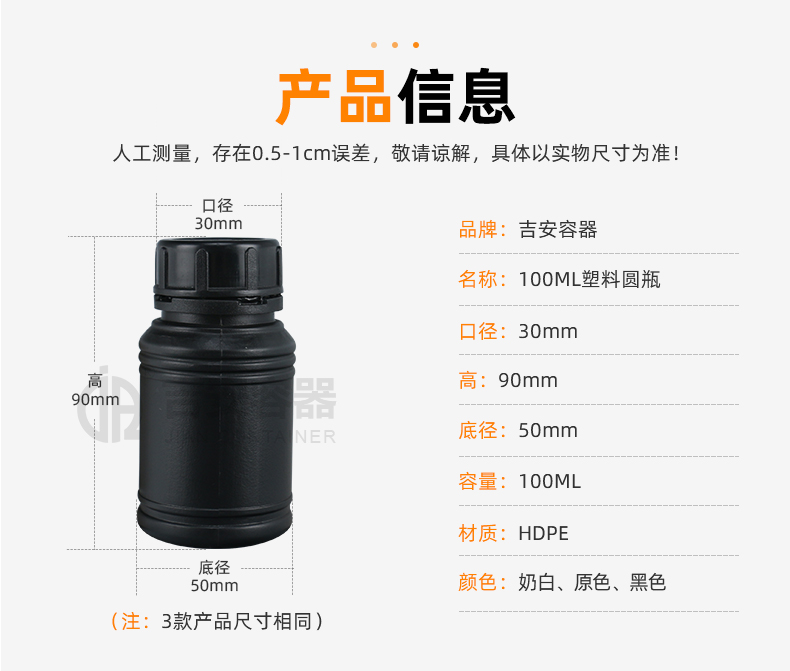 小口塑料瓶采用全新HDPE塑膠原料吹塑而成,具備韌性好、耐酸堿、耐腐蝕、不變形,密封性能佳等特點,可根據客戶需求定製、改色、產品適用於化工、清洗劑、醫藥、液體、食品、農業等各行業包裝。