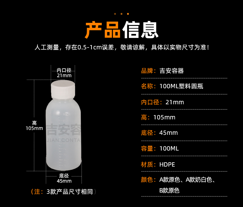 小口塑料瓶采用全新HDPE塑膠原料吹塑而成,具備韌性好、耐酸堿、耐腐蝕、不變形,密封性能佳等特點,可根據客戶需求定製、改色、產品適用於化工、清洗劑、醫藥、液體、食品、農業等各行業包裝。