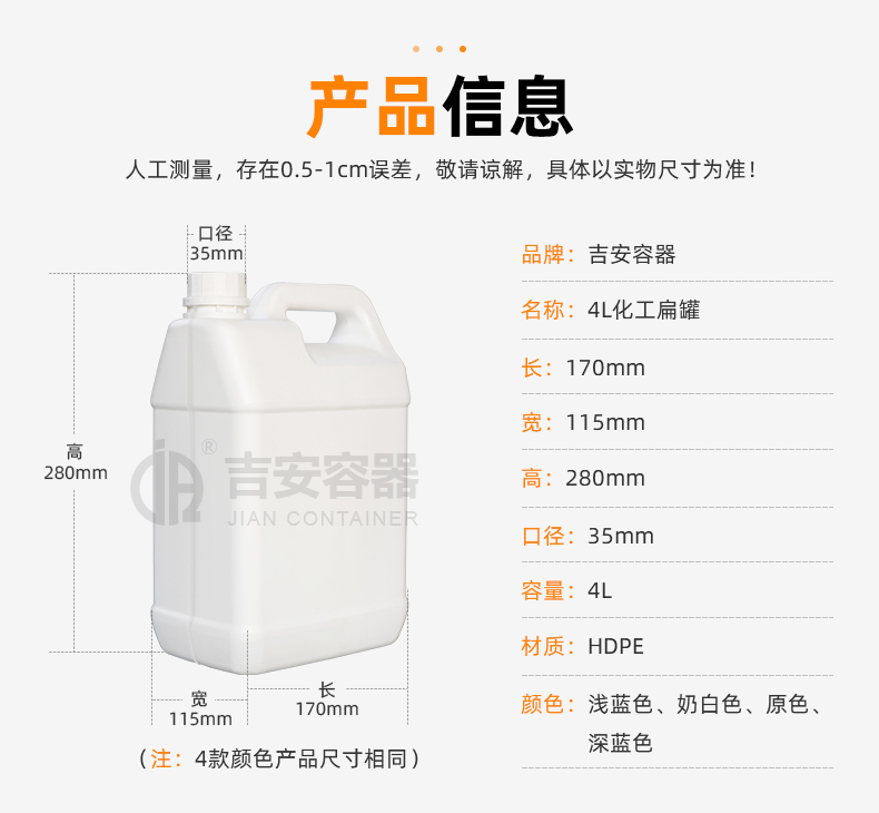 塑料扁罐采用HDPE原材料吹塑而成,具有良好的耐酸堿性及密封性,方形設計方便堆放,不占用空間,美觀實用。具備不變形,使用方便等特征,可根據客戶需求做印刷及貼膜,產品適用於尿素、機油、汽油、清洗劑、化工助劑、食品添加劑等液體包裝。